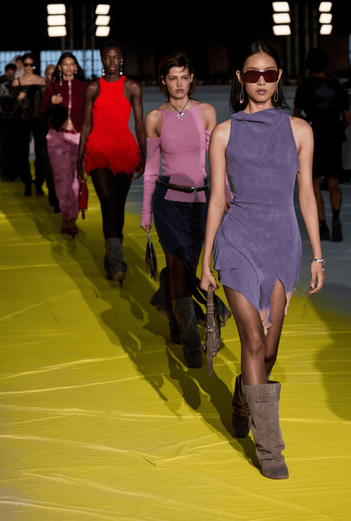 Desigual Studio FW25 se presentó como un “Back to the Roots”, un regreso a los orígenes reinterpretados con un lenguaje contemporáneo y experimental. Entre los looks más destacados estuvieron la reinvención de la icónica chaqueta Patch 1984 en piel natural con print denim, chaquetas oversize con efecto denim, bombers con cuello de pelo y vestidos de seda teñidos a mano. El logo de Desigual se convirtió en un gesto artístico que se fragmenta, borda y expande sobre distintos materiales, transformando cada prenda en un lienzo en movimiento.