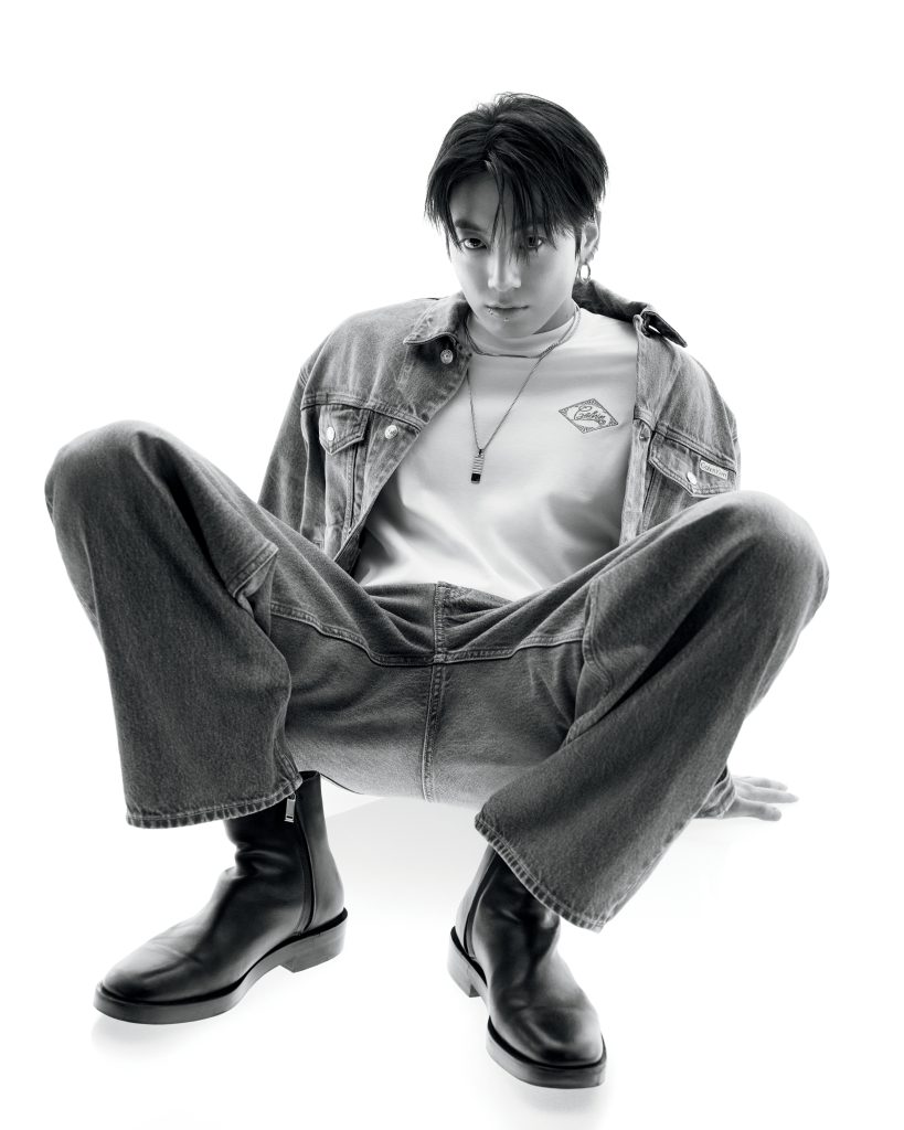Jung Kook aparece con los esenciales de la temporada: conjuntos completos de denim, una chaqueta de cuero con borde de borrego y siluetas que evocan el espíritu de los años 90. La colección apuesta por un estilo relajado pero preciso, con lavados vintage, cortes holgados y piezas pensadas para mezclarse sin esfuerzo. La idea no es imponer tendencia, sino mostrar una forma de vestir que fluye, respira y se siente propia.